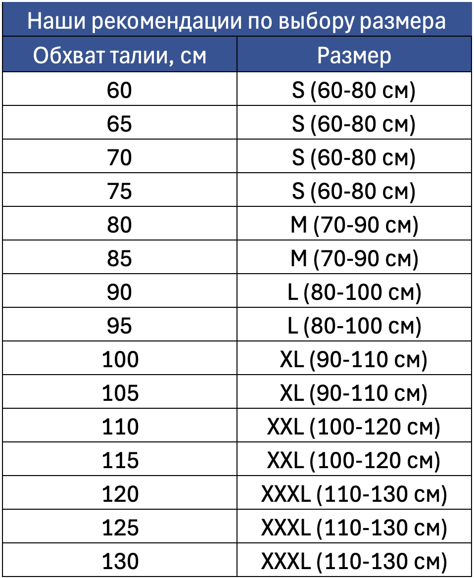 XS (50-70), S (60-80), M (70-90), L (80-100), XL (90-110), XXL (100-120), XXXL (110-130).